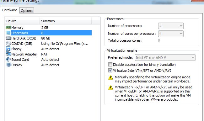 - A demás en el apartado de procesadores hay que habilitar las opciones de virtualización como modo preferido seleccionamos Intel VT-x or AMD-V, marcando la opción de virtualización de Intel VT-x/EPT or AMD-V/RVI.